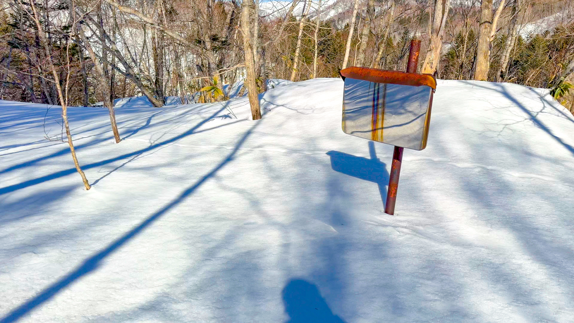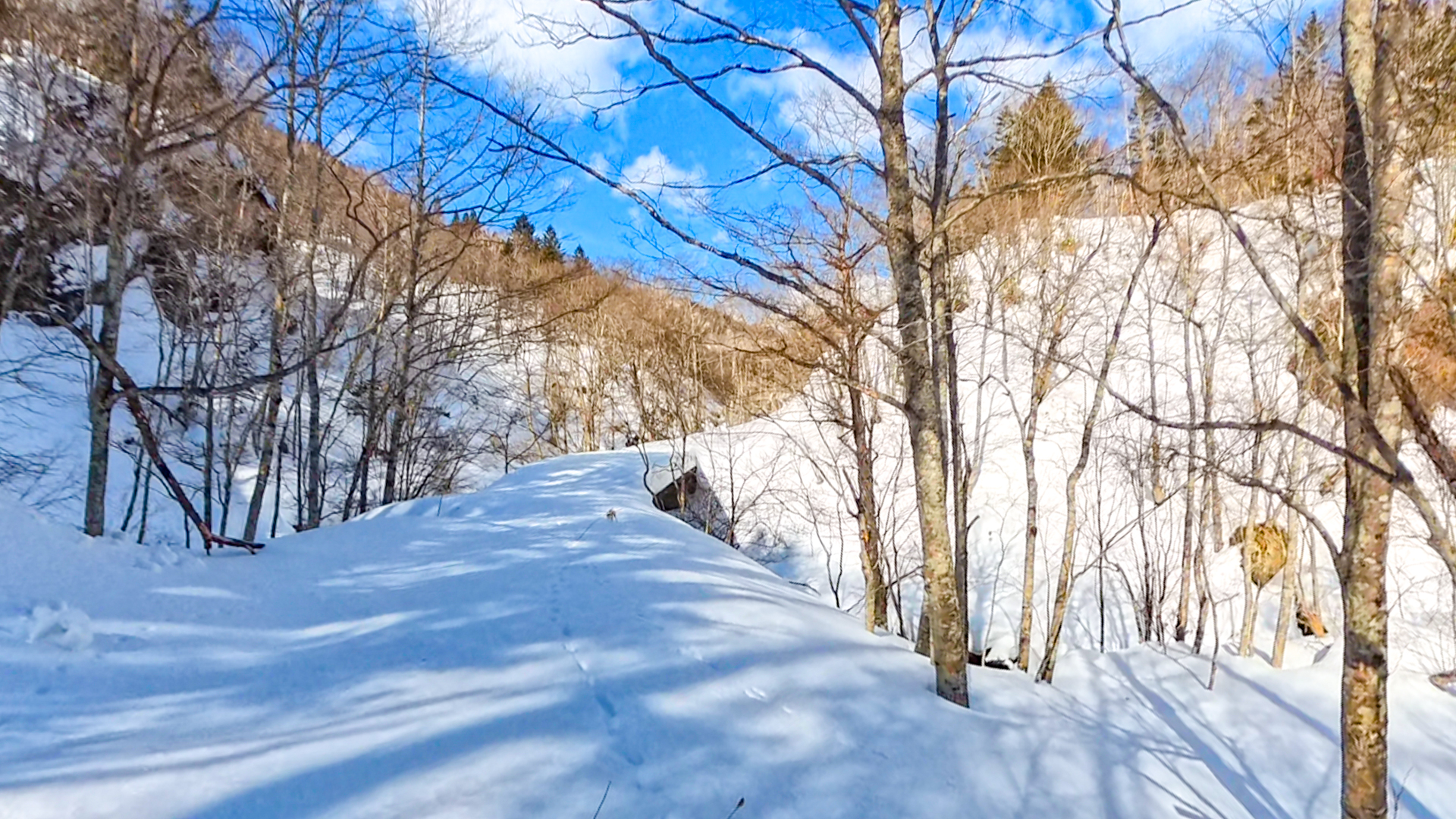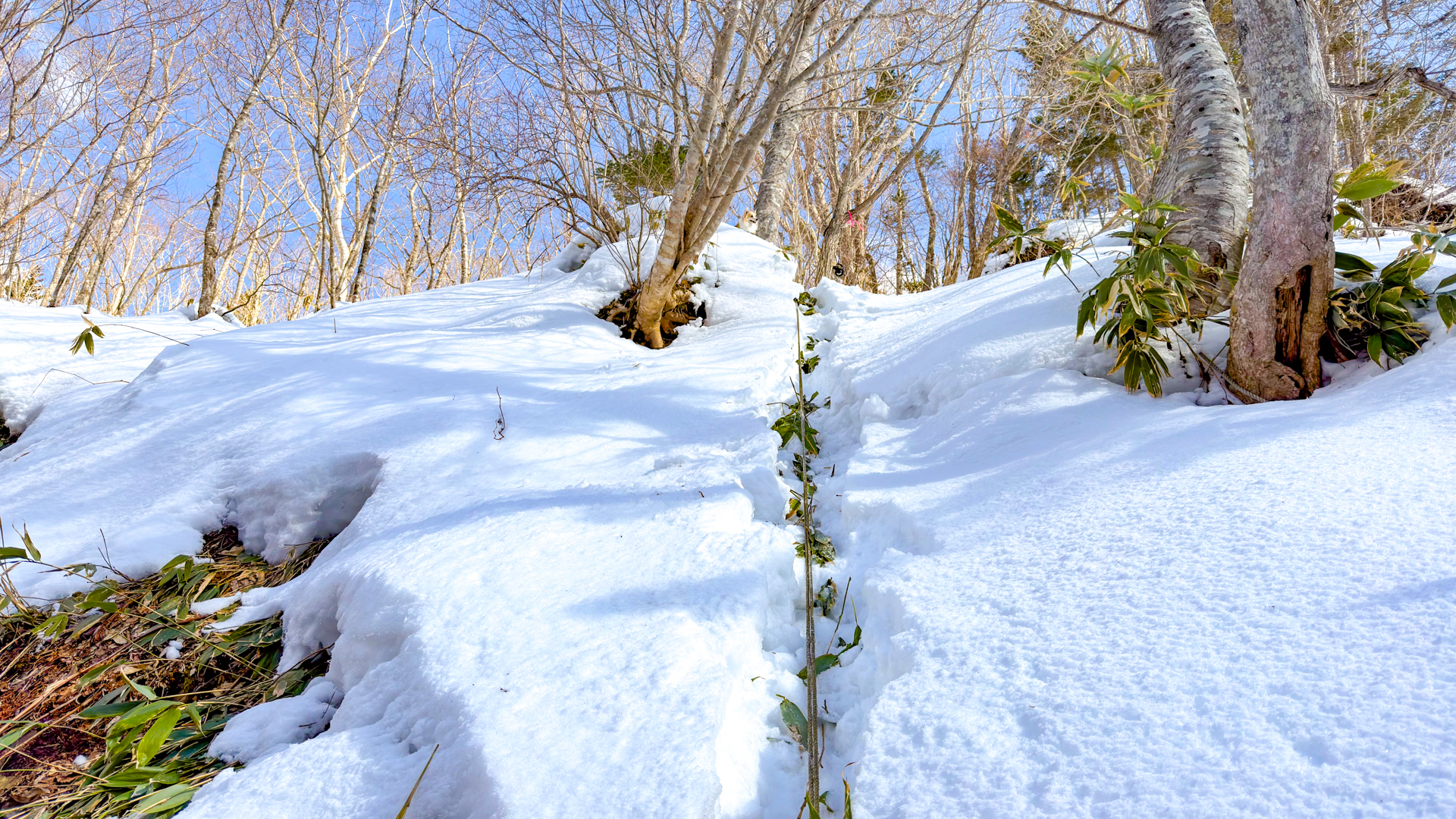 大前提としてスノーシューがなければまともに歩けません。その上、夏場と違い林道付近まで車で近づけません。歩くスキーでは、崖崩れや雪崩のせいでかなり危険な箇所があります。